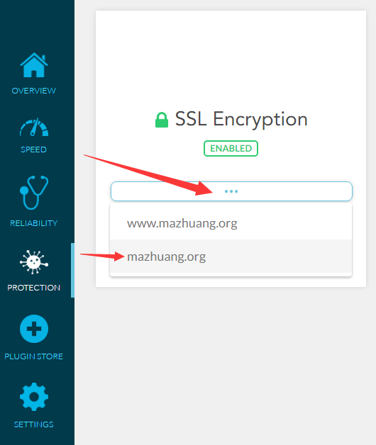 进入到 Dashboard 的 PROTECTION,点击 SSL Encryption 里的按钮,选择你的网站: