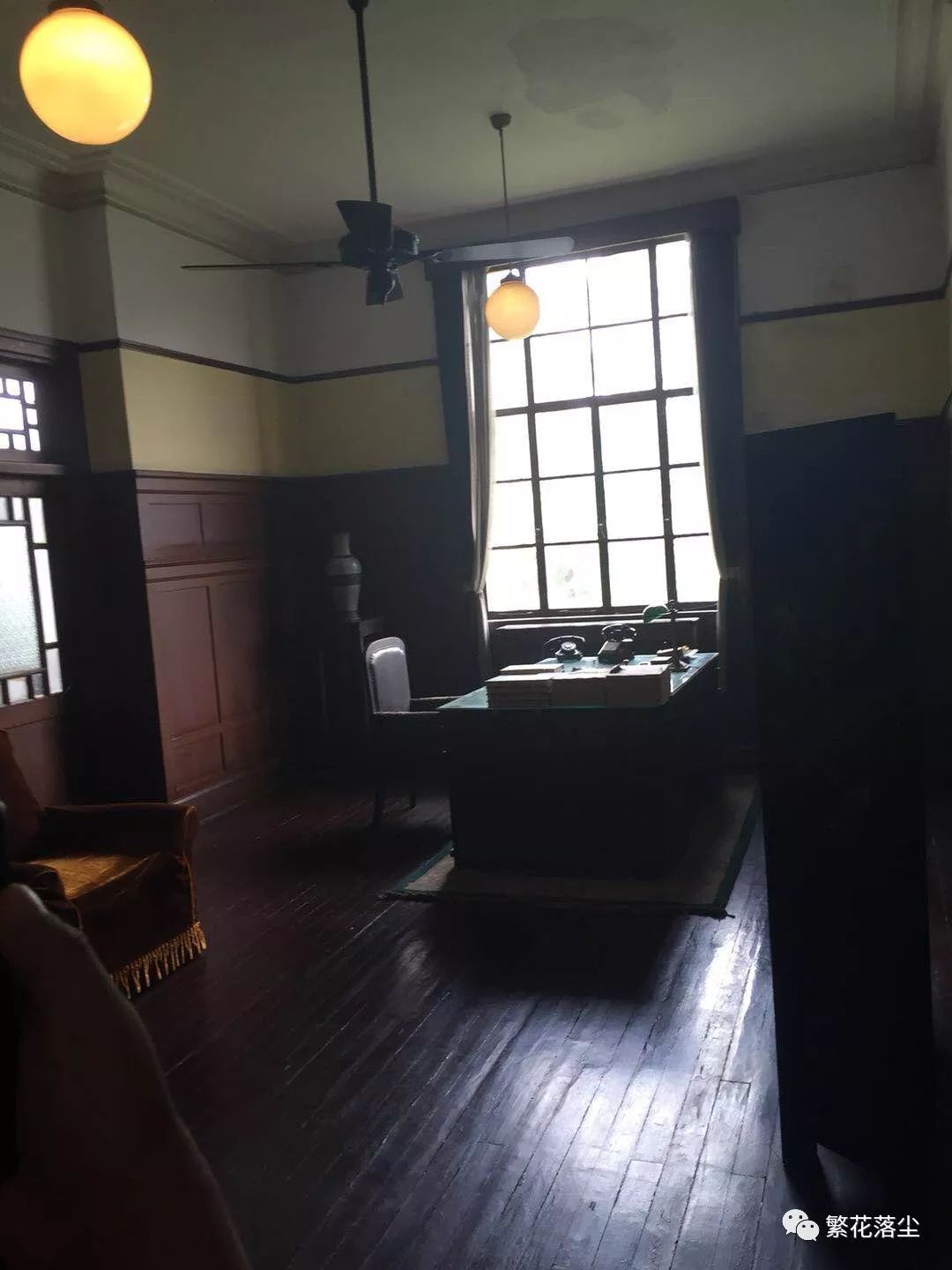 有一些阁楼上面还保留着民国时期的著名人物的办公地址,风格显得大气敞亮,漆红色的门,漆红色的地板,漆红色的办公室,满眼都是漆红色,米黄的灯色,因为年代久远显得有点陈旧暗淡,体现着民国时期黑暗的时代特点。