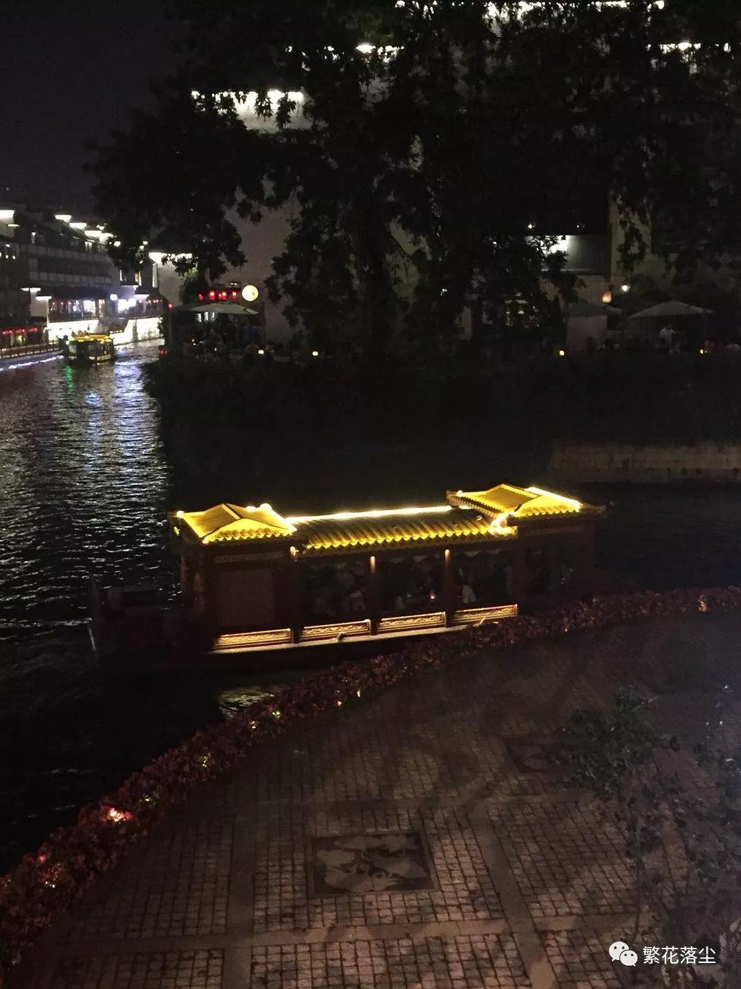 走着,逛着,笑着;明亮着,暗淡着,闪烁着;历史感,沧桑感,静谧感;这些各种各样的元素斑驳交瘁,构成了五彩缤纷的江南水乡的意境。因为目不暇接的是各种小古典工艺品,折扇,宣纸,墨竹,玉蝶,古色古香,所以笑着;因为远处璀璨的光影与古老旧址的冷寂交错,所以闪烁着;因为满目疮痍的墙角青苔遍地,时过千年的流水静静述说,所以是静谧感。随着人流穿行,更多的感受是江南的温柔已然浸入了这里人们的骨子里,精致的饮食,绵软的话语和对古典诗词歌赋的追求,“风吹柳花满店香,吴姬压酒唤客尝”。