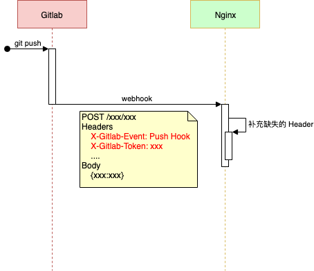 方案的原理简单来说就是 Gitee 在触发 webhook 时,向目标网址发起的请求和 GitLab 很雷同,只是有个别 Header 的名字不一样,但缺失特定的 Header 信息后无法正常触发 Tapd 的源码关联,所以可以通过 Nginx 反向代理来将缺失的 Header 补全,然后将请求转发给 Tapd 即可。