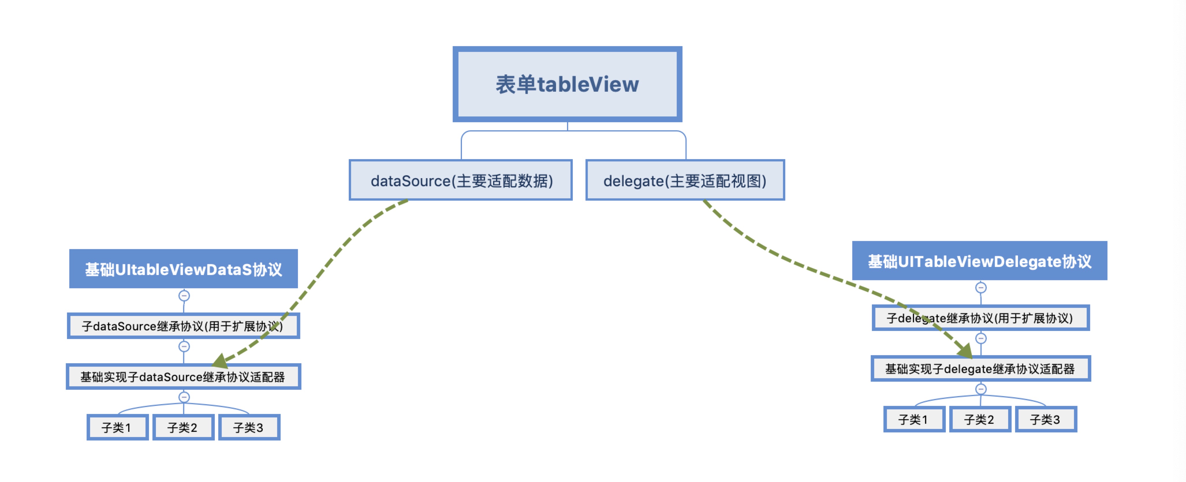 具体的在图片里已经有说明,实质上也就是通过协议和适配器将数据和控制器达到某种程度上的分离,如果在delegate中关于视图操作更复杂化,那么要么扩展协议进行处理,要么就是不采用这种方式,灵活而定。其中子类1、子类2等就是让我们可以进行代理适配器的变更达到更换适配逻辑而不影响控制层或者是整体结构等的目的。