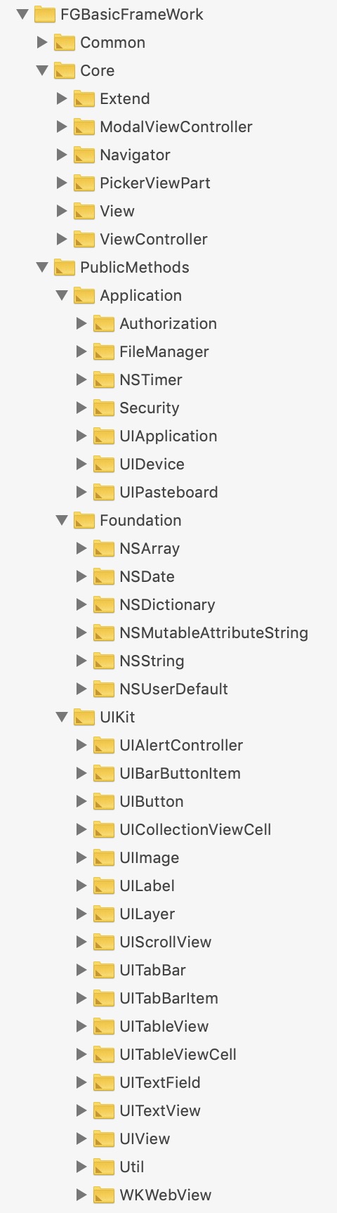 PublicMethods层 UIAlertController+FGBlocks 1 2 3 4 5 6 7 8 9 10 11 12 13 14 15 16 17 18 19 20 21 22 23 24 25 26 27 28 29 30 31 32 33 34 35 36 37 38 39 40 41 42 43 44 45 46 47 48 49 50 51 52 53 54 55 56 57 58 59 60 61 62 63 64 65 66 /// 弹出alert/actionsheet /// @param viewController 当前控制器 /// @param title 标题 /// @param message 内容 /// @param preferredStyle 弹出方式 /// @param cancelButtonTitle 取消按钮标题 /// @param destructiveButtonTitle 作用按钮标题 /// @param otherButtonTitles 附加按钮标题 /// @param popoverPresentationControllerBlock 气泡菜单回调 /// @param tapBlock 按钮点击回调 + (nonnull instancetype)fg_showInViewController: (nonnull UIViewController *)viewController withTitle: (nullable NSString *)title message: (nullable NSString *)message preferredStyle: (UIAlertControllerStyle)preferredStyle cancelButtonTitle: (nullable NSString *)cancelButtonTitle destructiveButtonTitle: (nullable NSString *)destructiveButtonTitle otherButtonTitles: (nullable NSArray *)otherButtonTitles popoverPresentationControllerBlock: (nullable UIAlertControllerPopoverPresentationControllerBlock)popoverPresentationControllerBlock tapBlock: (nullable UIAlertControllerCompletionBlock)tapBlock;// / 弹出alert / // @param viewController 当前控制器 /// @param title 标题 /// @param message 内容 /// @param cancelButtonTitle 取消按钮标题 /// @param destructiveButtonTitle 作用按钮标题 /// @param otherButtonTitles 附加按钮标题 /// @param tapBlock 按钮点击回调 + (nonnull instancetype)fg_showAlertInViewController: (nonnull UIViewController *)viewController withTitle: (nullable NSString *)title message: (nullable NSString *)message cancelButtonTitle: (nullable NSString *)cancelButtonTitle destructiveButtonTitle: (nullable NSString *)destructiveButtonTitle otherButtonTitles: (nullable NSArray *)otherButtonTitles tapBlock: (nullable UIAlertControllerCompletionBlock)tapBlock;// / 弹出actionsheet / // @param viewController 当前控制器 /// @param title 标题 /// @param message 内容 /// @param cancelButtonTitle 取消按钮标题 /// @param destructiveButtonTitle 作用按钮标题 /// @param otherButtonTitles 附加按钮标题 /// @param popoverPresentationControllerBlock 气泡菜单回调 /// @param tapBlock 按钮点击回调 + (nonnull instancetype)fg_showActionSheetInViewController: (nonnull UIViewController *)viewController withTitle: (nullable NSString *)title message: (nullable NSString *)message cancelButtonTitle: (nullable NSString *)cancelButtonTitle destructiveButtonTitle: (nullable NSString *)destructiveButtonTitle otherButtonTitles: (nullable NSArray *)otherButtonTitles popoverPresentationControllerBlock: (nullable UIAlertControllerPopoverPresentationControllerBlock)popoverPresentationControllerBlock tapBlock: (nullable UIAlertControllerCompletionBlock)tapBlock;@property (readonly, nonatomic) BOOL visible; // 是否可视@property (readonly, nonatomic) NSInteger cancelButtonIndex; // 取消索引@property (readonly, nonatomic) NSInteger firstOtherButtonIndex; // 第一个附加按钮索引@property (readonly, nonatomic) NSInteger destructiveButtonIndex; // 动作按钮索引