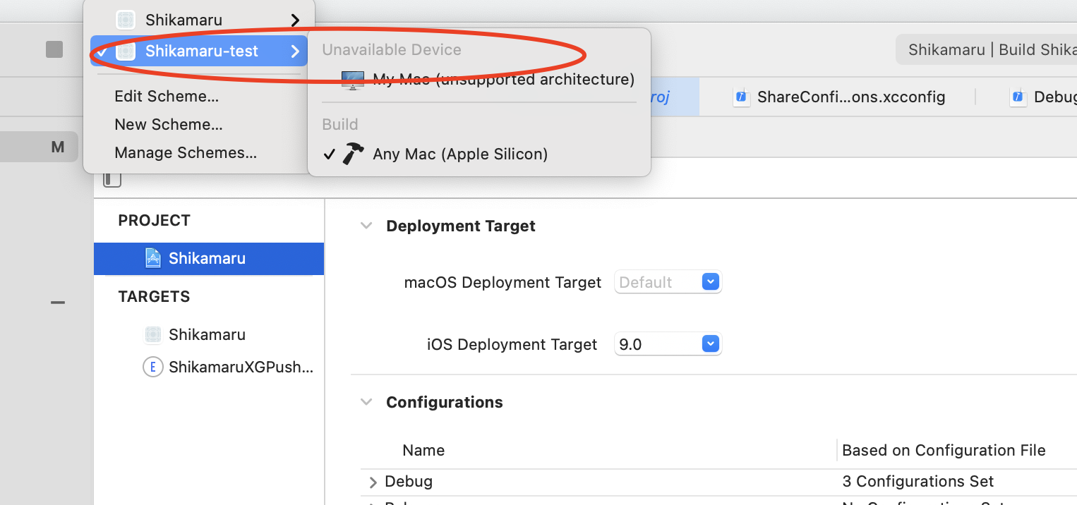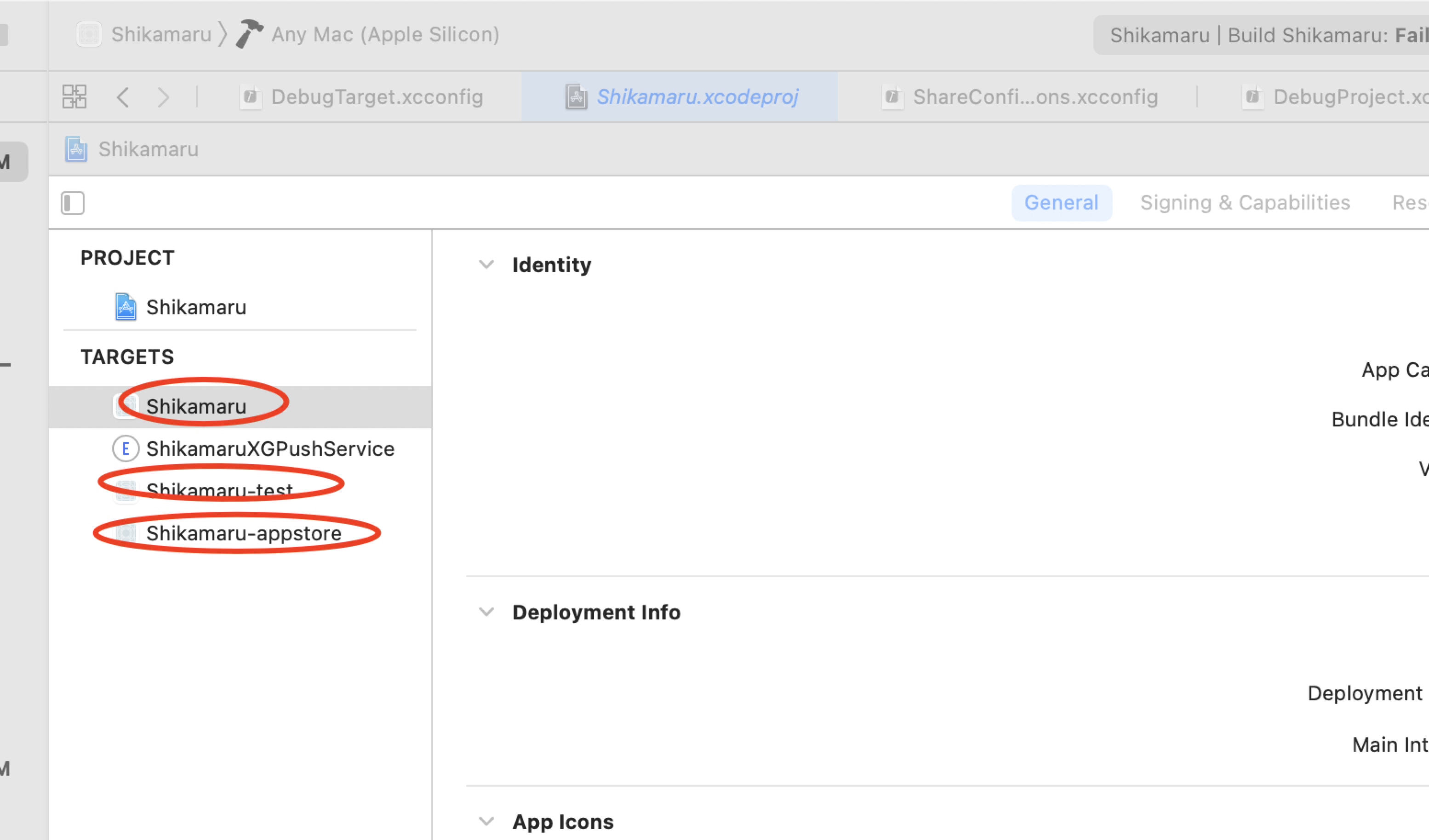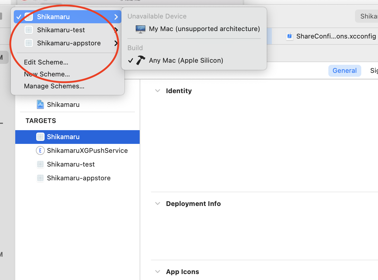 这里打开可以看到对应三个target,也就是可以切换不同的target来确定构建目标,不过一般来说,不会在这里切换,会对应环境构建Scheme来进行切换。