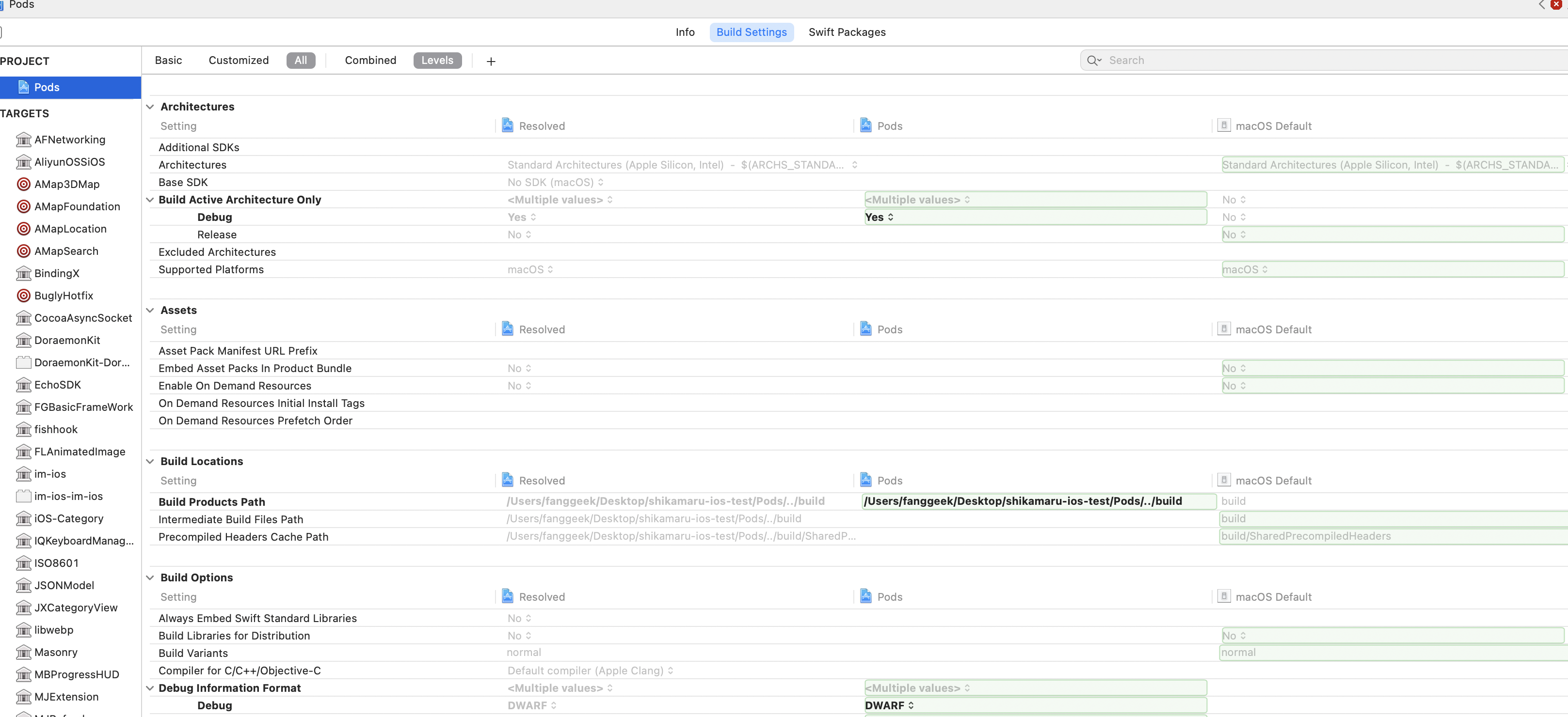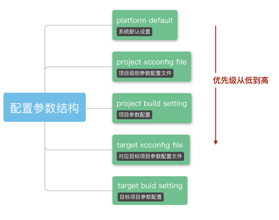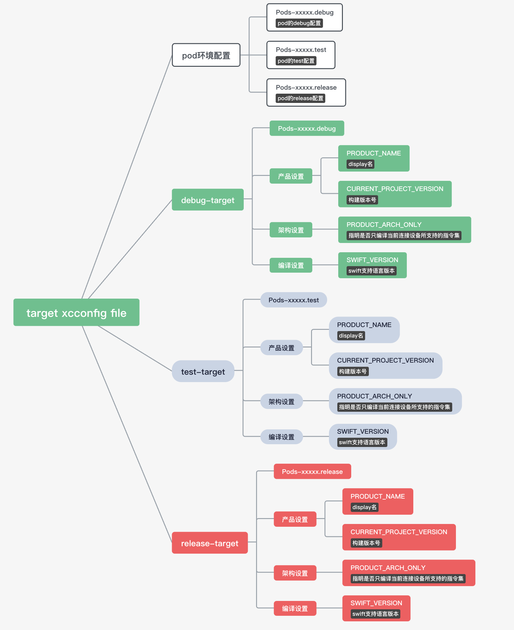 xcconfig文件的修改实际上是修改BuildSettings中的参数,这里包含3种层次的类型文件:Project xcconfigFile、Target xcconfig File、Pod xcconfig File(一般会自动生成,需要进行include引用)