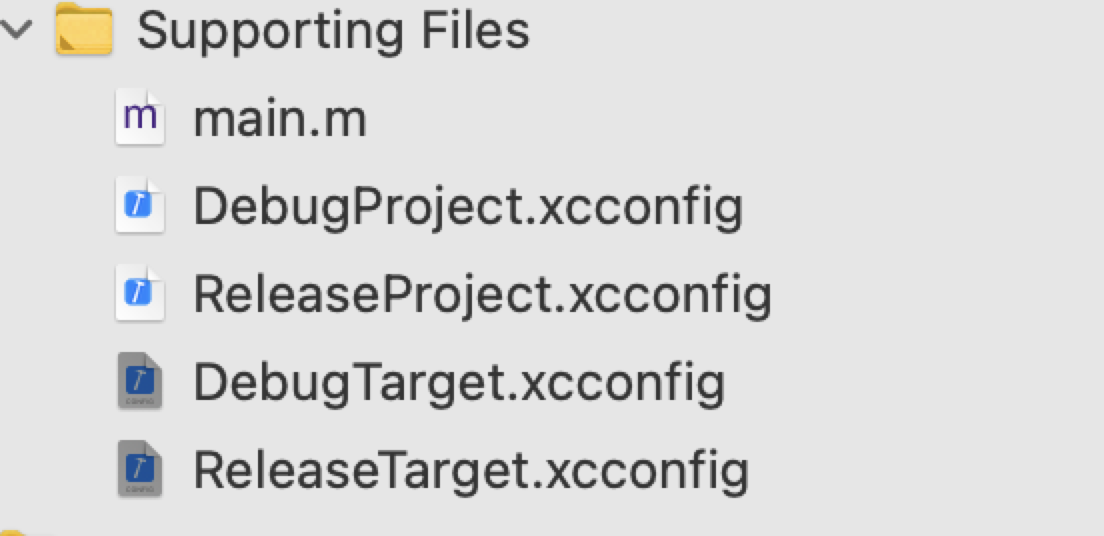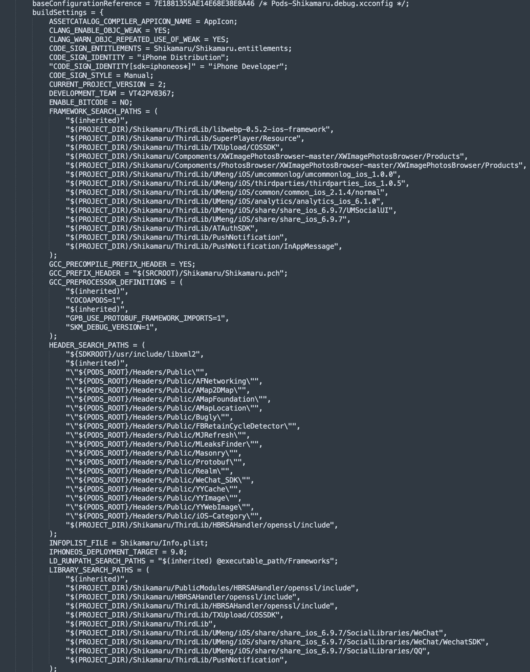 ,由手工修改变成了”外界配置”,再按照上述定义来看,我们可以确定,我们需要的是一BuildSettings,那么也就是一组xcconfig文件,由于是文件,那么可以用git进行统一管理.里面的内容格式类似于: