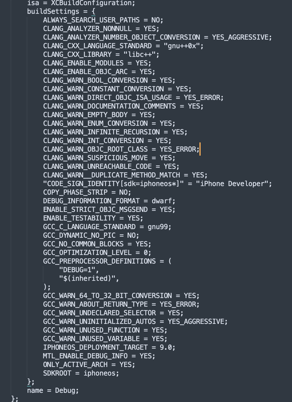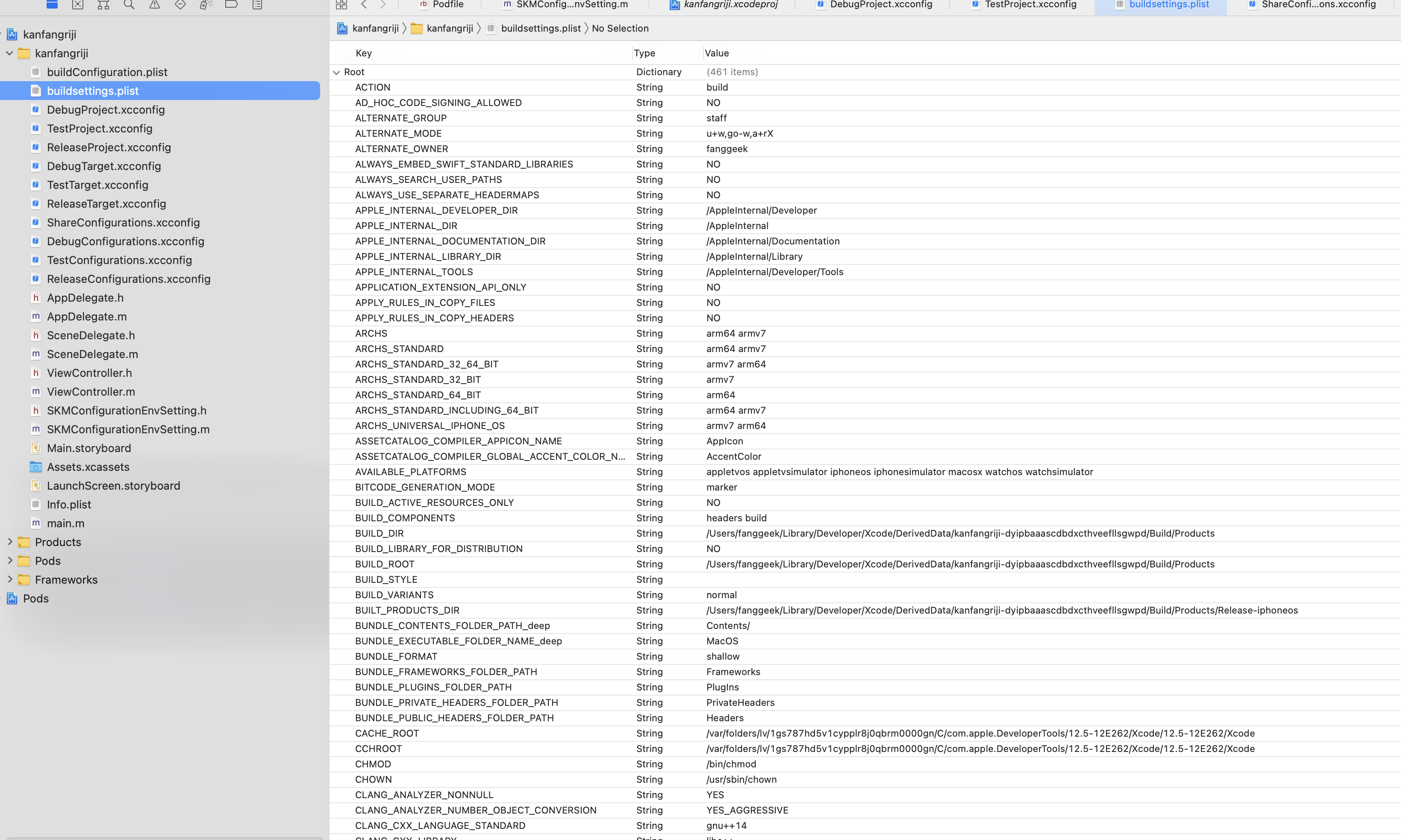 注意一下xcode项目里定义的BuildSettings参数,可以从project.pbxproj里面去找到,如图所示: