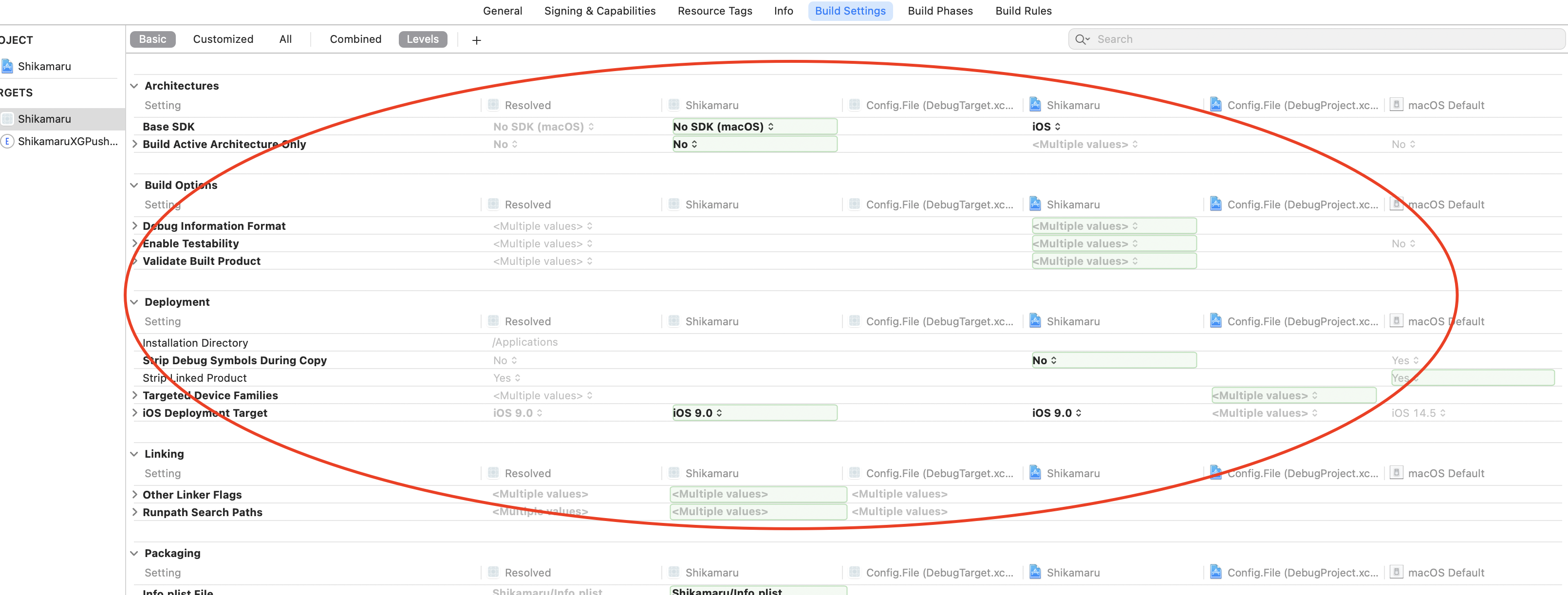 3.纯粹手动BuildSettings配置,如果出现丢失或者删除,难以对比跟踪,带来编译错误也查找困难